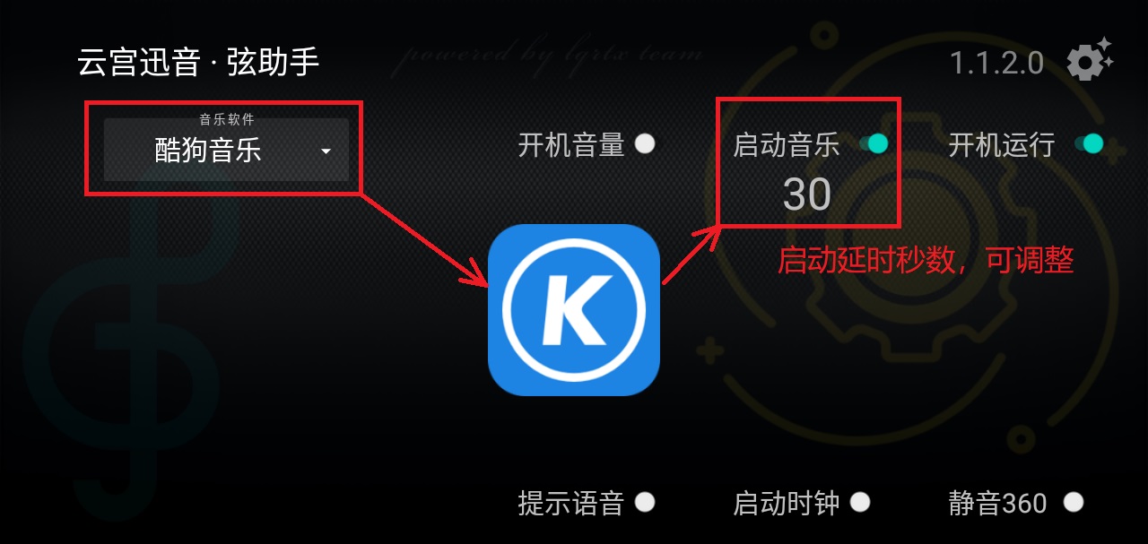 启动音乐开关下面的数字为延时秒数,默认延时30秒,可以自行调整(延时范围:0~120秒)。