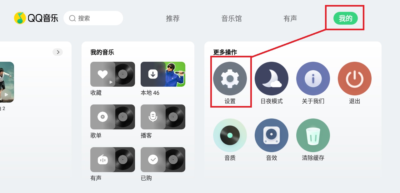< 返回 蘑菇云 < QQ音乐 酷狗音乐5.0 酷狗音乐3.5 随心听 AIMP播放器打开QQ音乐,点击我的 -> 设置